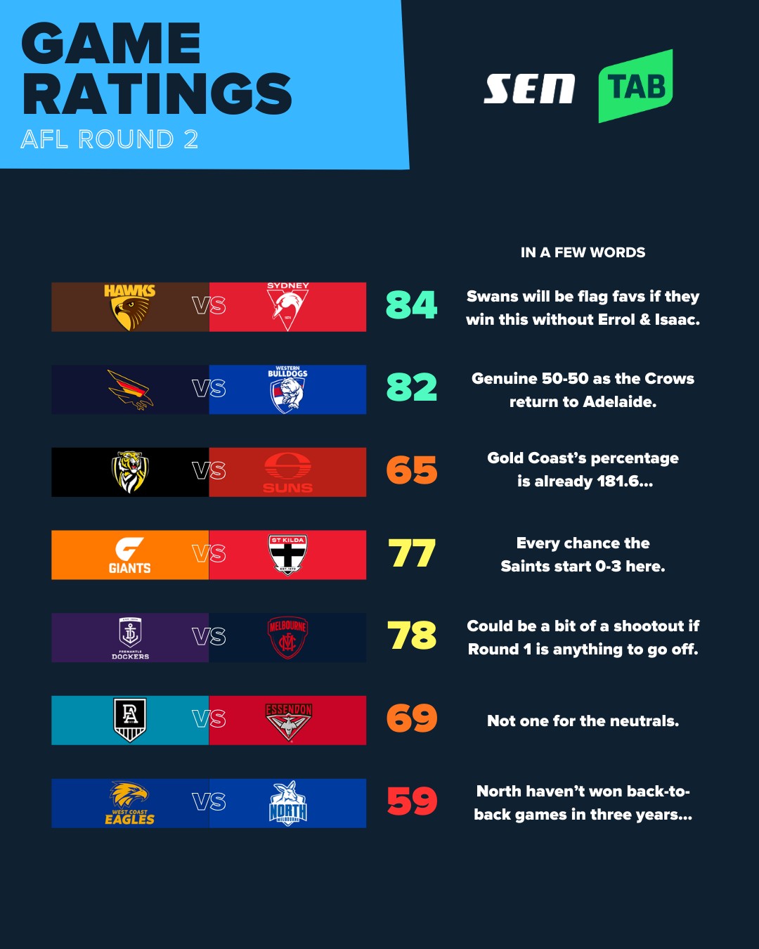 SEN.com.au's AFL Game Ratings for Round 2, 2026